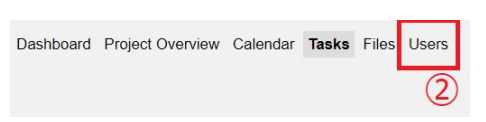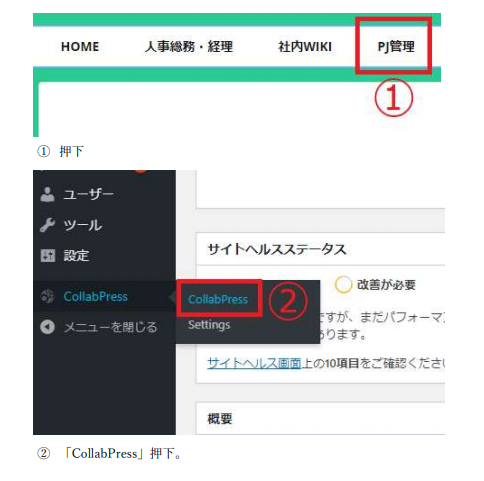①管理画面に入るために「PJ管理」をクリックします。