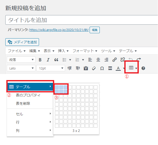 ②「テーブル」クリック