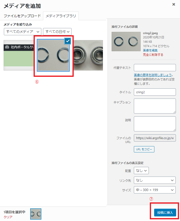 ⑦「投稿に挿入」をクリック