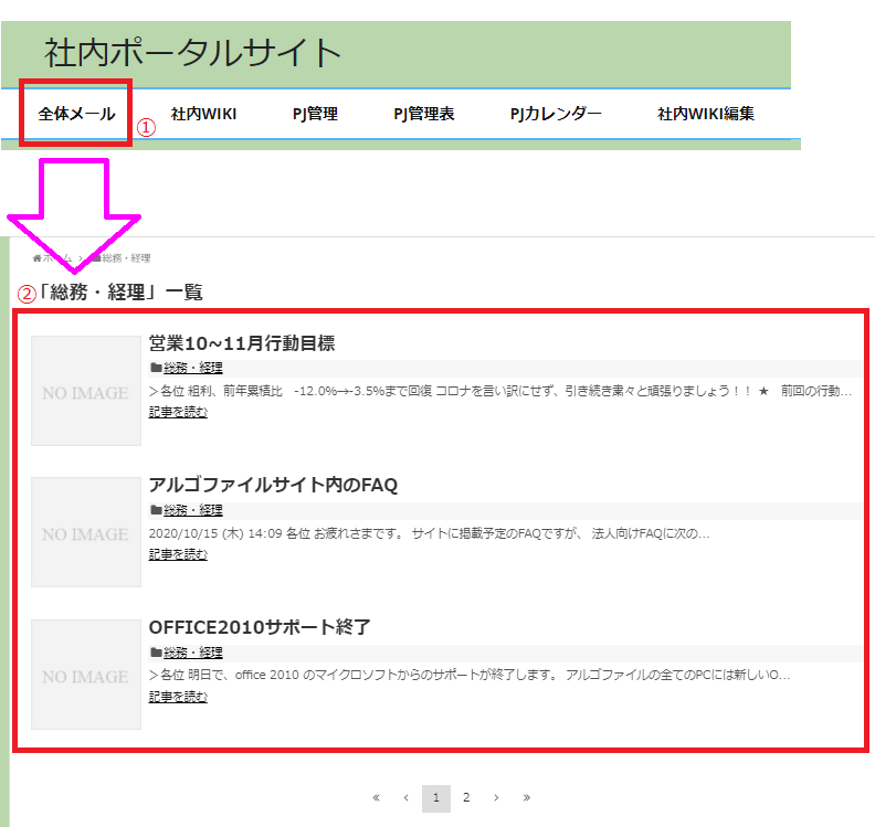 新着情報に載っていない過去の全体メールを見る場合は、左上の「全体メール」をクリックすれば、閲覧できます。