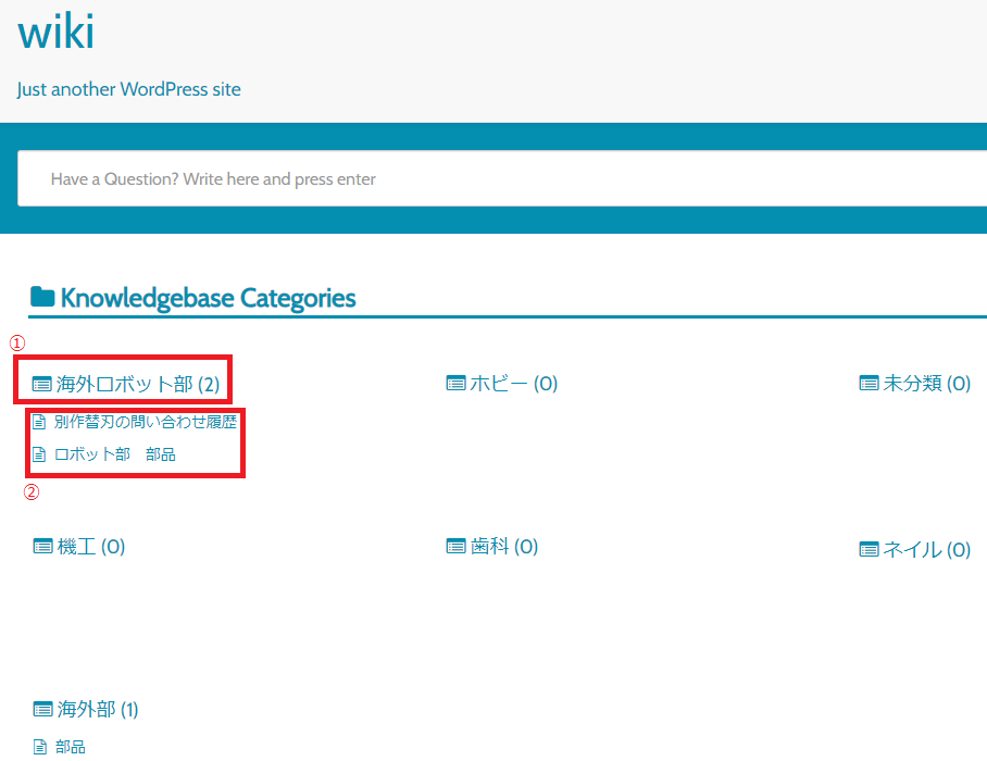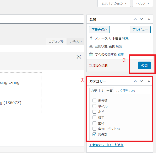 ①カテゴリー(部署、担当)を選択。ここでは例として「海外部」にチェックをいれました。