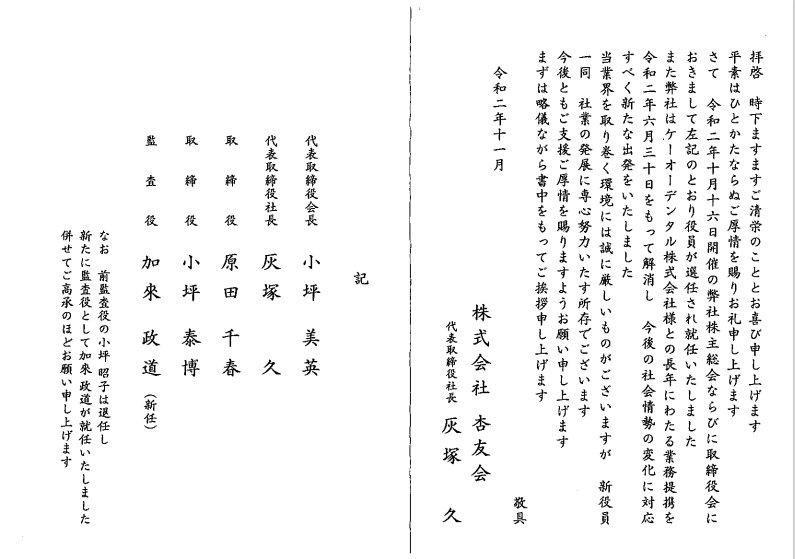 【回覧】新役員就任と業務提携解消の挨拶(株式会社 杏友会)11/17/2020