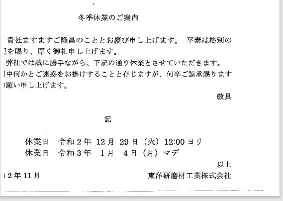 【回覧】年末年始の休業のお知らせ(東洋研磨剤工業株式会社)