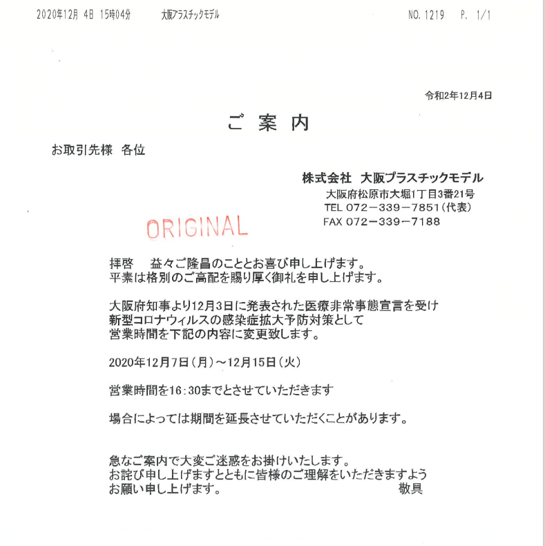 【回覧】コロナによる営業時間短縮のお知らせ(株式会社 大阪プラスチックモデル)