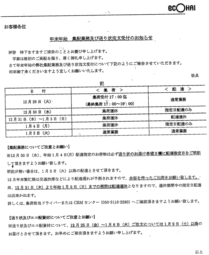 【回覧】年末年始の集荷業務&送り状注文受付のお知らせ(エコ配)
