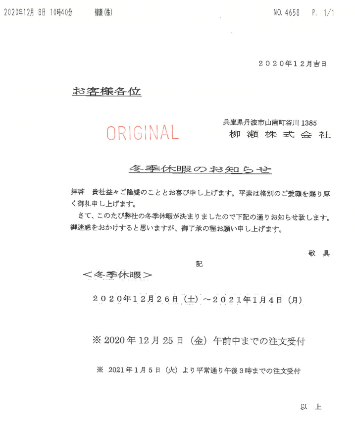 【回覧】年末年始休業のお知らせ(柳瀬株式会社)