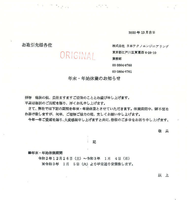 【回覧】年末年始休業のお知らせ 12/26→1/4 (株式会社日本テクノエンジニアリング)