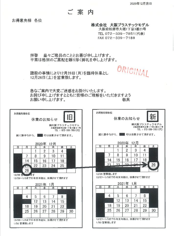 【回覧】年末年始休業の変更のお知らせ(大阪プラスチックモデル)