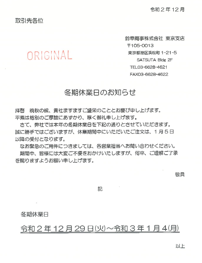 【回覧】年末年始休業のお知らせ 12/29→1/4(鈴幸商事株式会社 東京支店)