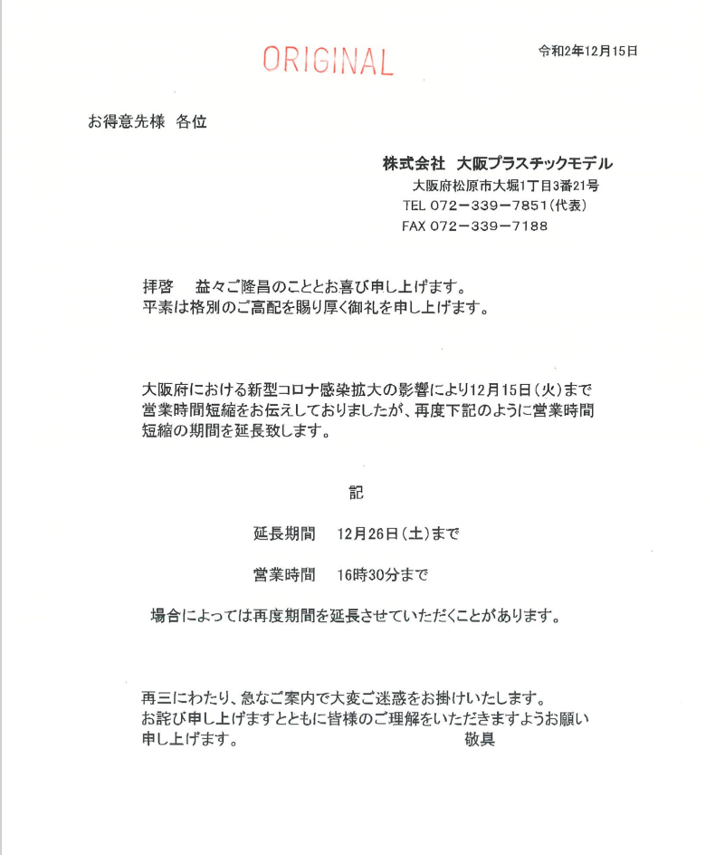 【回覧】コロナによる営業時間短縮の延長のお知らせ:12/26(土)まで終業16:30(株式会社大阪プラスチックモデル)