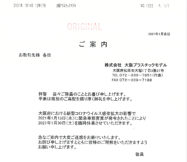 【回覧】臨時休業のお知らせ 1/30(土)株式会社大阪プラスチックモデル