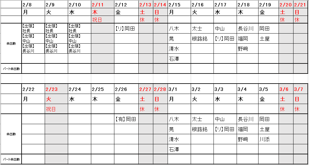 ・出張・会食の禁止(2/8~10のタ・中・長の北海道出張は特別許可)