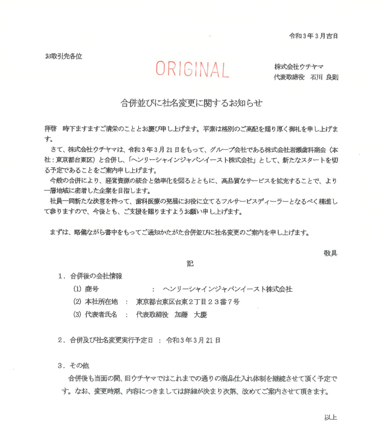 【回覧】合併及び社名変更のお知らせ(株式会社ウチヤマ)