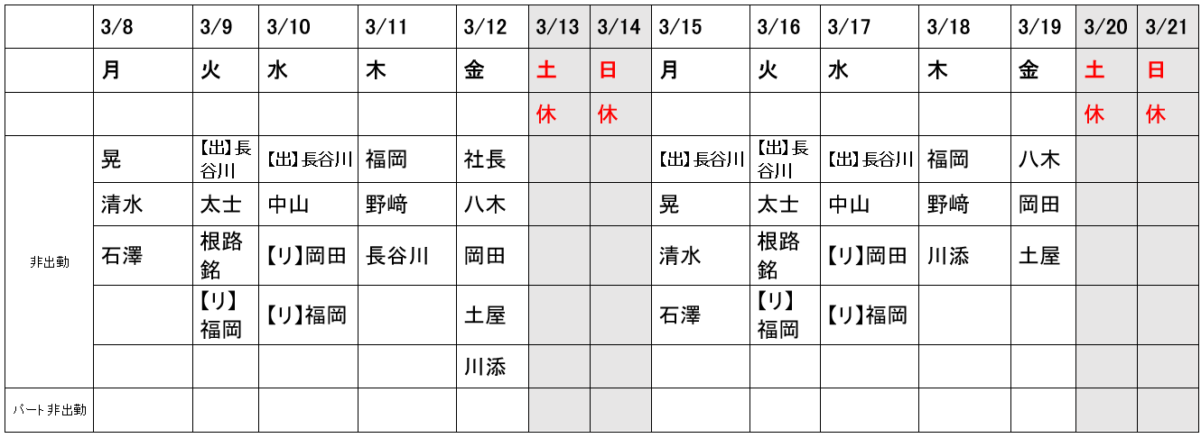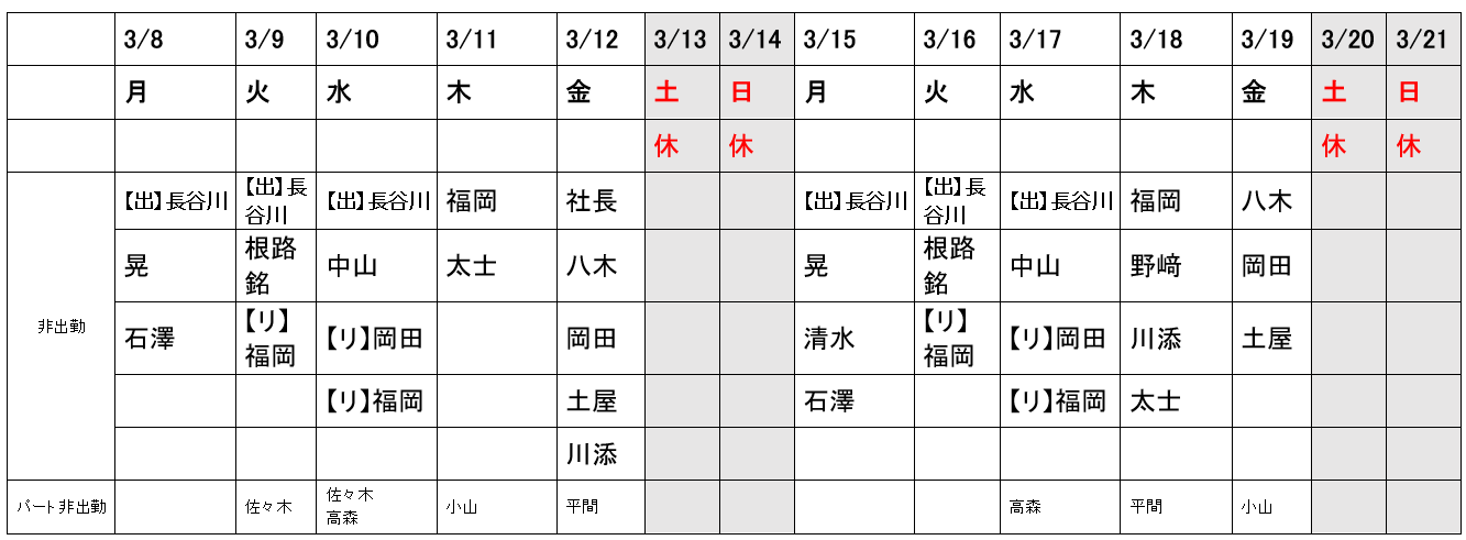 ・出張・会食の禁止(3/8~10、3/15~17の酒・長の出張は特別許可)