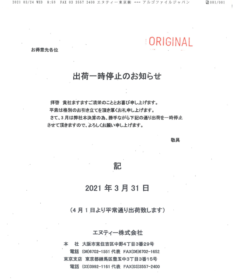 【回覧】出荷一時停止のお知らせ(エヌティー株式会社)