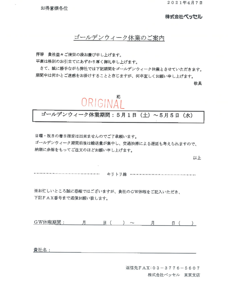 【回覧】GW休業の案内 5/1(土)→5/5(水) (株式会社ベッセル)