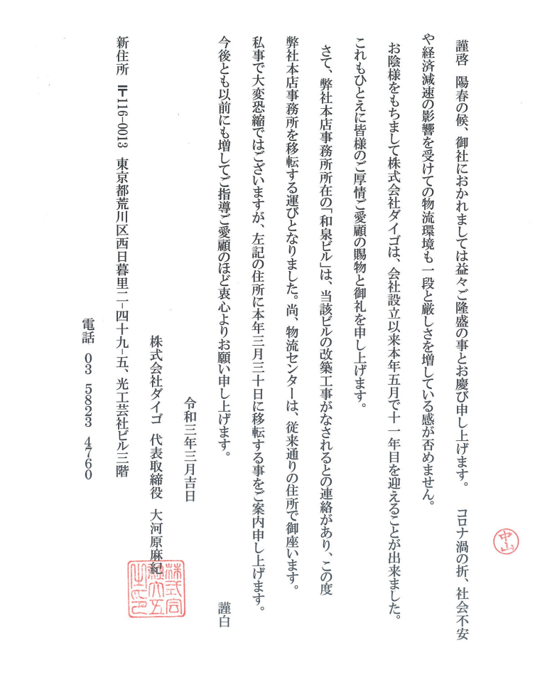 【回覧】本店事務所の移転の案内(株式会社ダイゴ)