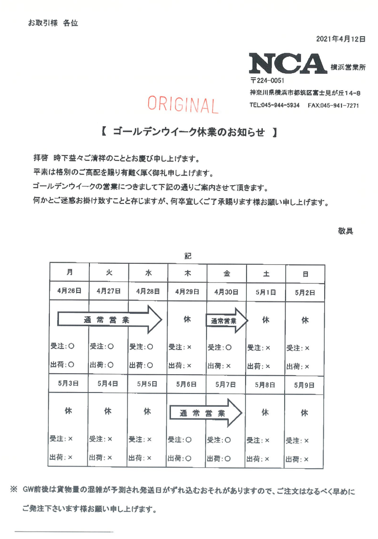 【回覧】GW休業の案内 5/1(土)→5/5(水) (NCA横浜営業所)