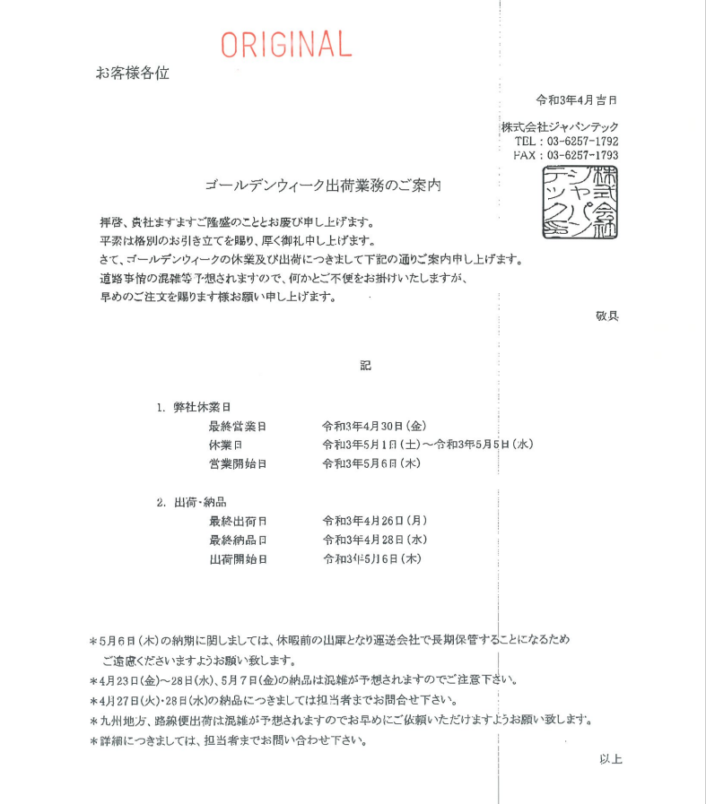 【回覧】GW休業5/1(土)→5/5(水)と出荷業務の案内(株式会社ジャパンテック)