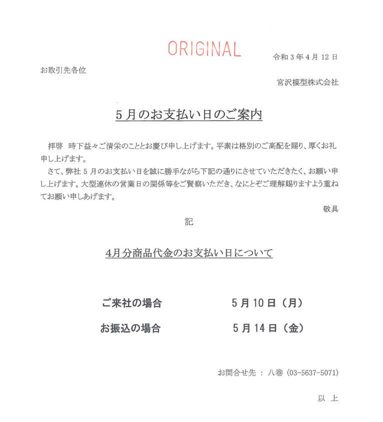 【回覧】5月の支払日の案内(宮沢模型株式会社)