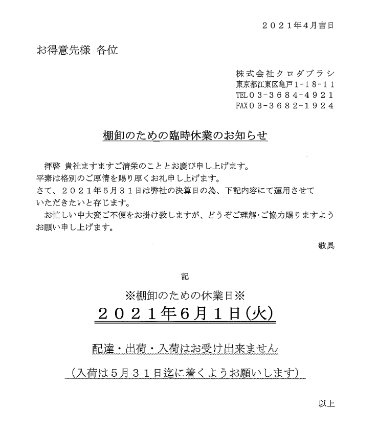 【回覧】臨時休業のお知らせ 6/1(火) (株式会社クロダブラシ)