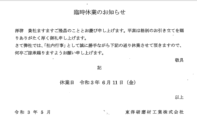 【回覧】臨時休業のお知らせ 6/11(金)(東洋研磨剤工業株式会社)