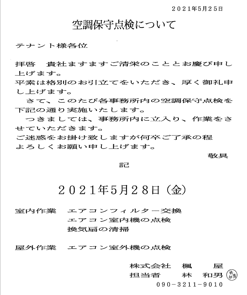 【回覧】空調保守点々について:実施日5/28(金)(株式会社楓屋)