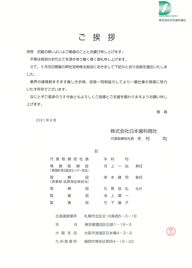 【回覧】新役員選任の挨拶(株式会社日本歯科商社)