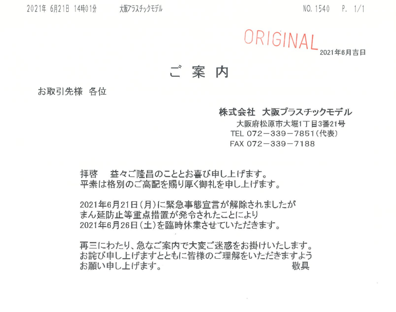 【回覧】臨時休業のお知らせ 6/26(土) (株式会社大阪プラスチックモデル)