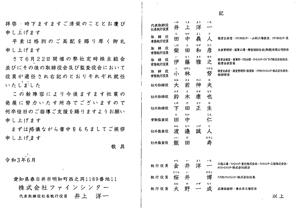 【回覧】役員人事のご挨拶(株式会社ファインシンター)