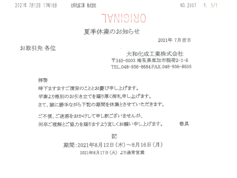 【回覧】夏季休業のお知らせ 8/12(木)→8/16(月)(大和化成工業株式会社)