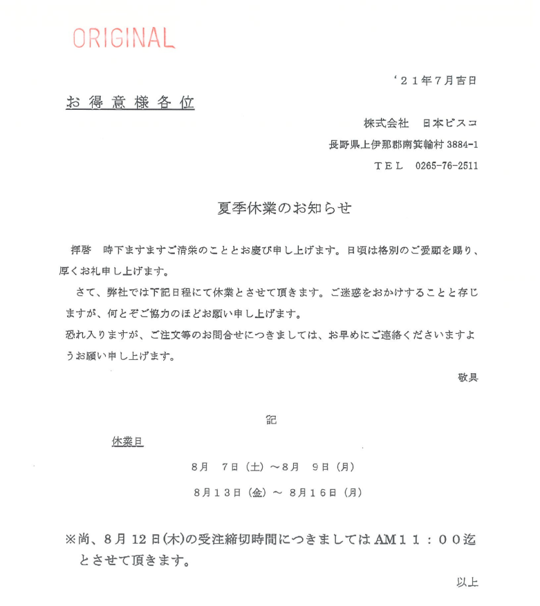 【回覧】夏季休業のお知らせ(株式会社 日本ピスコ)