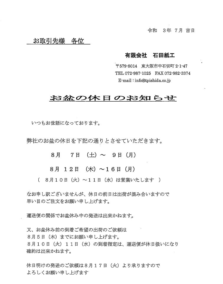 【回覧】夏季休業のお知らせ(有限会社 石田紙工)
