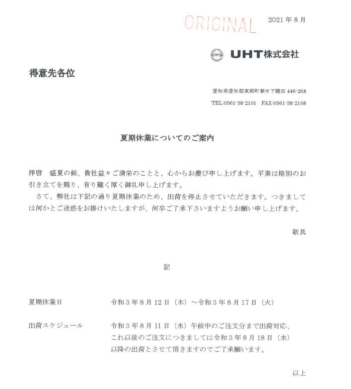 【回覧】夏季休業のお知らせ 8/12(木)→8/17(火)(UHT株式会社)