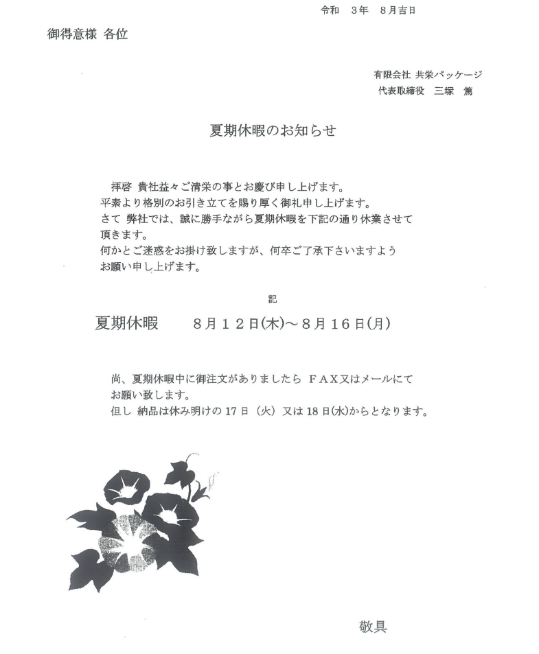 【回覧】夏季休業のお知らせ 8/12(木)→8/16(月)(有限会社 共栄パッケージ)