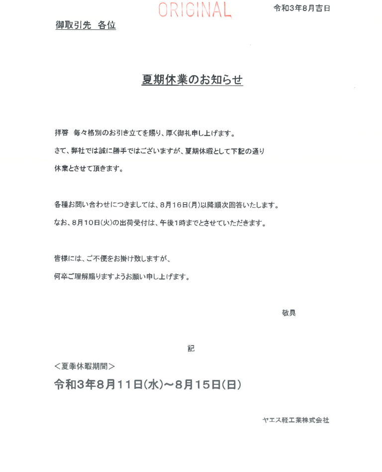 【回覧】夏季休業のお知らせ 8/11(水)→8/15(日)(八重洲軽工業株式会社)