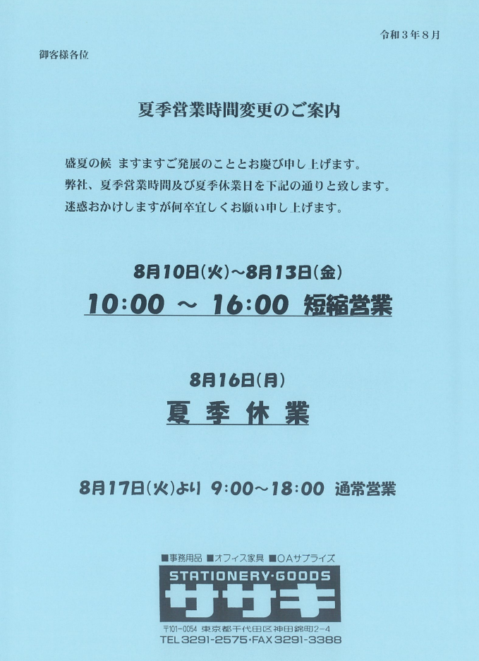 【回覧】夏季休業のお知らせ 8/11(水)→8/15(日)(八重洲軽工業株式会社)
