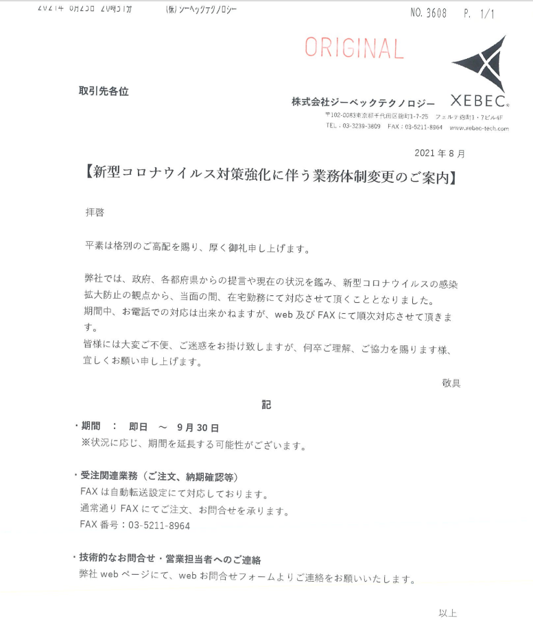 【回覧】新型コロナウイルス対策強化に伴う業務体制変更のご案内(株式会社ジーベックテクノロジー)