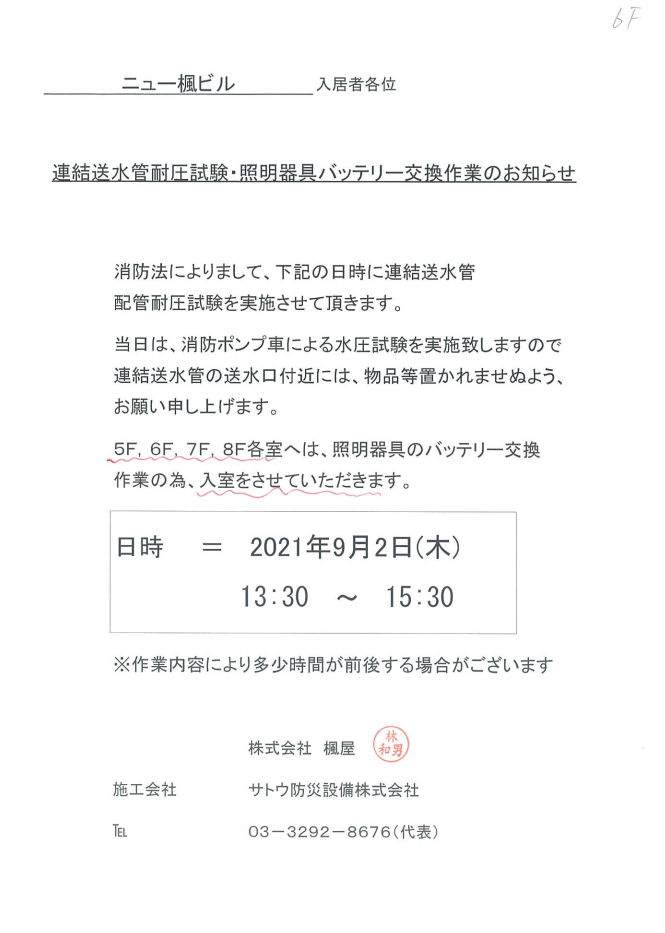 【回覧】連結送水管耐圧試験・照明器具バッテリー交換作業のお知らせ(楓屋)