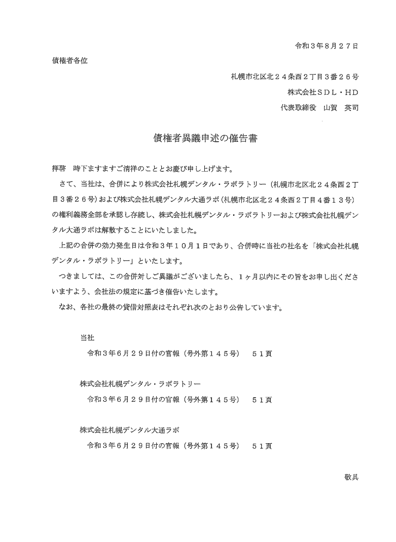 【回覧】債権者異議申述の催告書(株式会社SDL・HD)