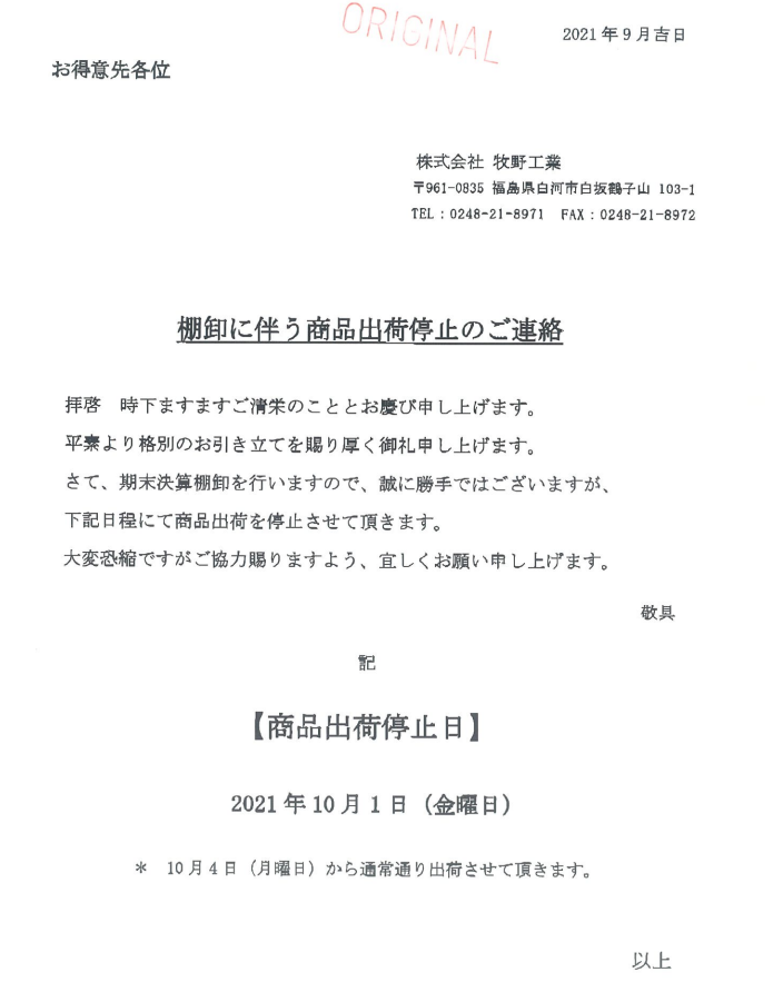 【回覧】棚卸に伴う商品出荷停止のご連絡(株式会社 牧野工業)