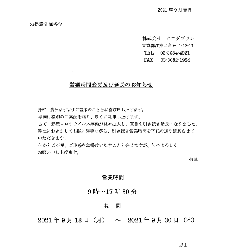 【回覧】営業時間変更及び延長のお知らせ(株式会社 クロダブラシ)
