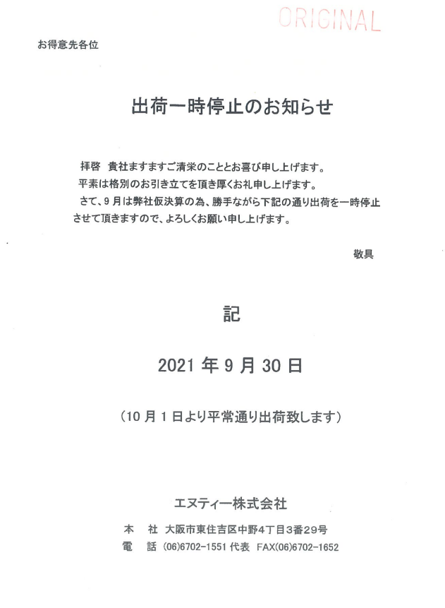 【回覧】出荷一時停止のお知らせ(エヌティー株式会社)
