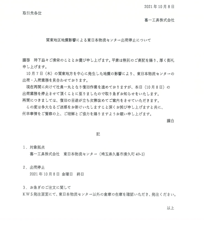 【回覧】地震の影響による東日本物流センター出荷停止について(喜一工具株式会社)