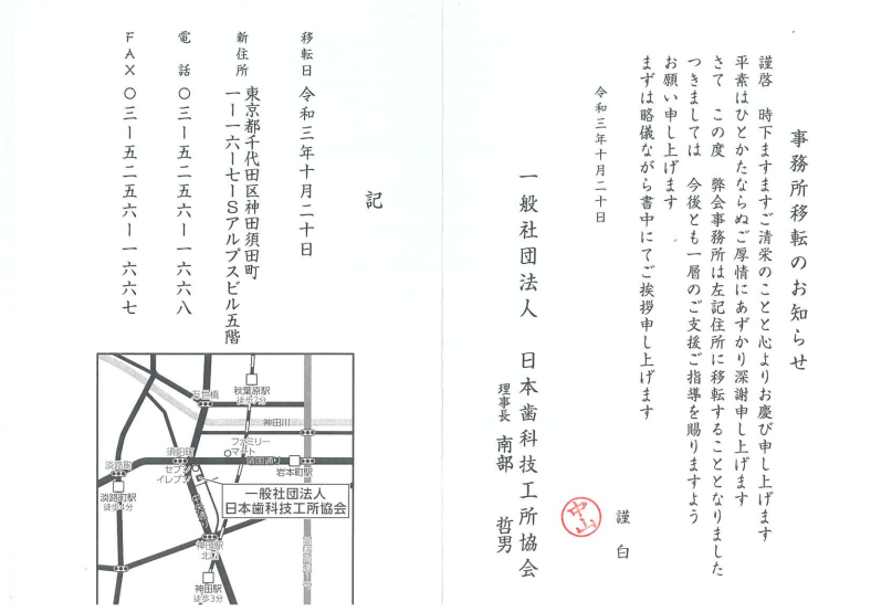 【回覧】事務所移転のお知らせ(一般社団法人 日本歯科技工所協会)
