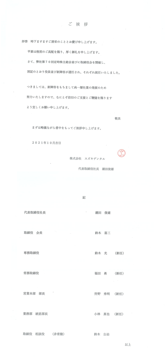 【回覧】役員人事のお知らせ(株式会社スズキデンタル)