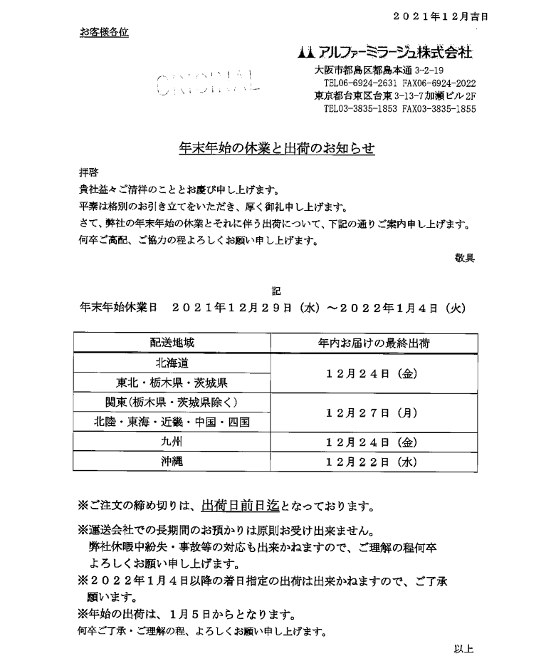 【回覧】年末年始の休業と出荷のお知らせ(アルファミラージュ株式会社)