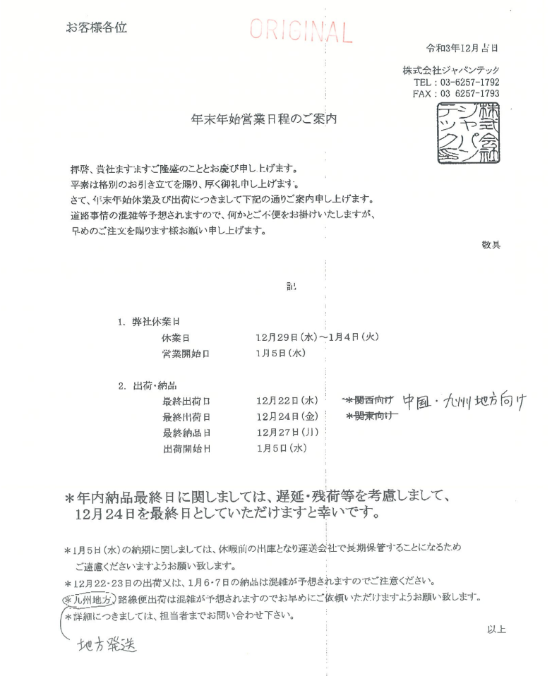 【回覧】年末年始営業の案内 12/29(水)→1/4(火)(株式会社ジャパンテック)