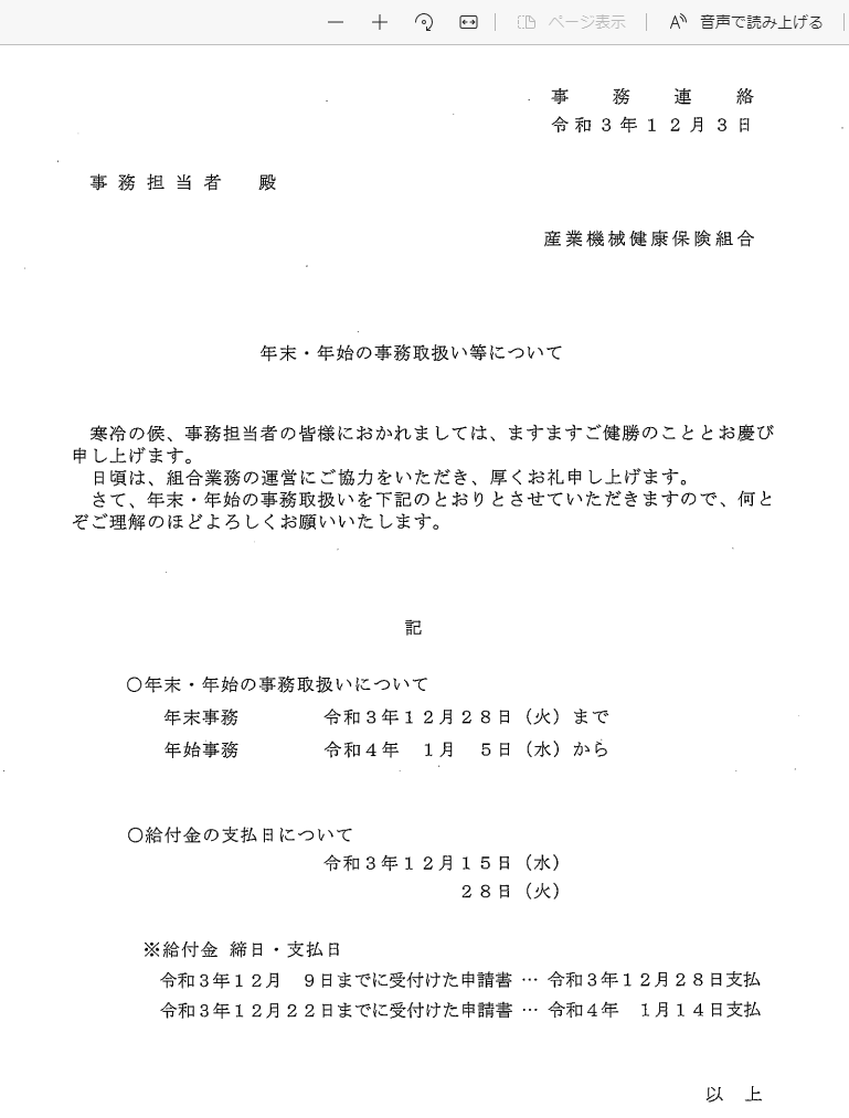 【回覧】年末年始の事務取り扱い等について(産業機械保険組合)