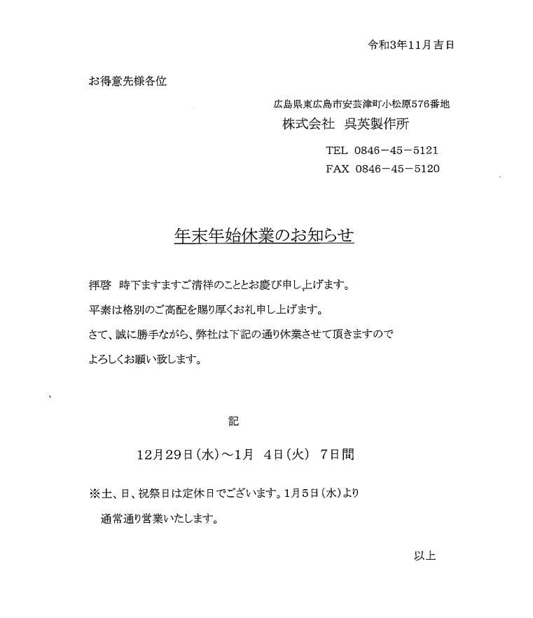 【回覧】年末年始休業のお知らせ 12/29(水)→1/4(火)(株式会社 呉英製作所)